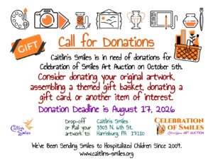 Calling all artists and donors! Donations of artwork, gift cards, and other items of interest are now being accepted for the Celebration of Smiles Art Auction. Your donation will be placed in our silent auction for bidding, and all proceeds go to help provide arts & crafts outreach to children in medical facilities.