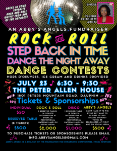 A summer fundraiser is in the works for July 23rd at The Peter Allen House.  To learn more about the upcoming fundraiser for Abby’s Angels, click here: “Rock and Roll: Step Back in Time Dance the Night Away.”